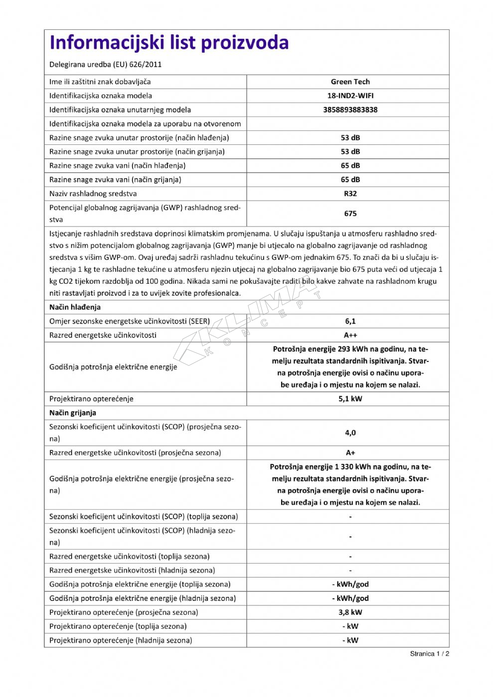 GREEN TECH INVERTER KLIMA UREĐAJ 18-IND2-WIFI - s grijačem u vanjskoj jedinici