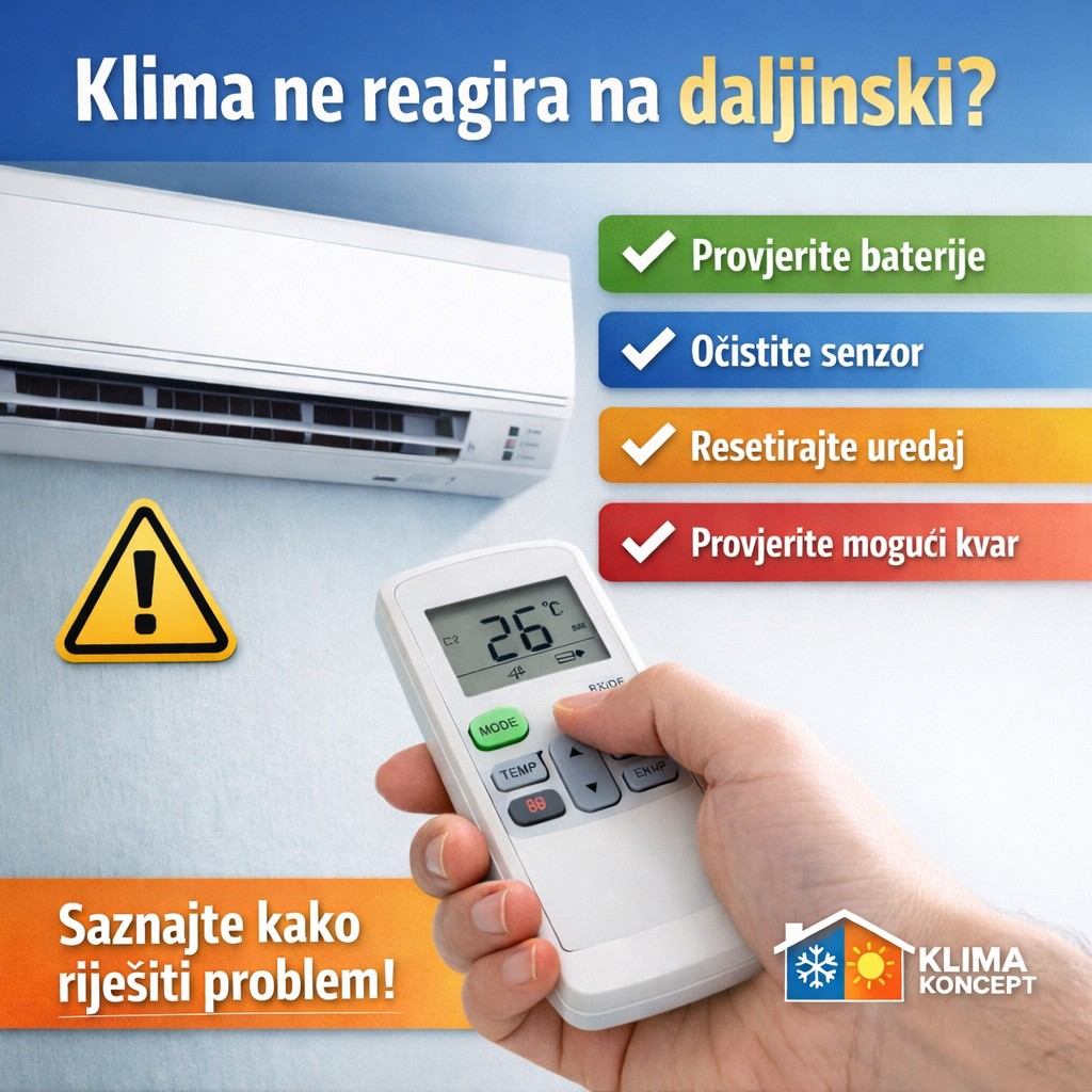 | Klima uopće ne reagira | Prazne baterije, kvar daljinskog, kvar prijemnika ili napajanja | Zamjena baterija, reset i provjera napajanja |