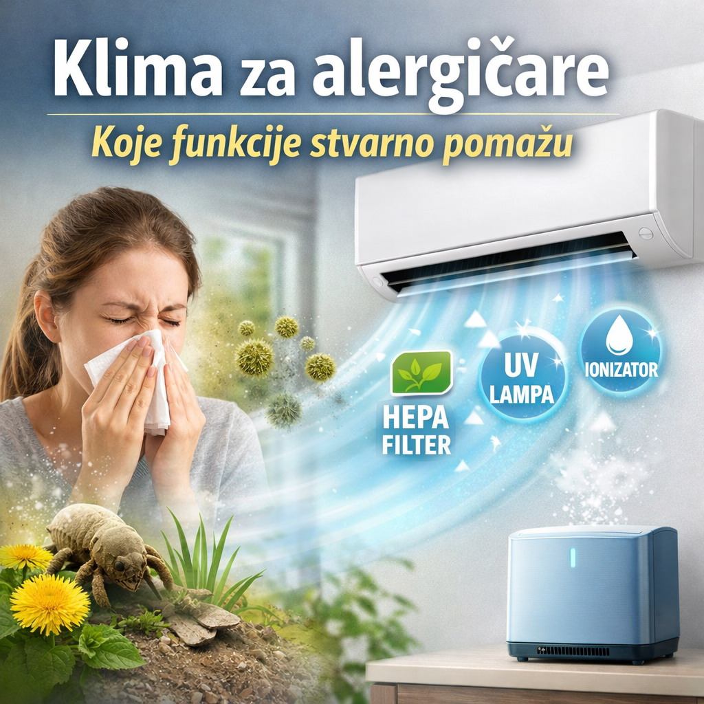 Klima za alergičare može zaista pomoći, ali samo ako ima kvalitetnu filtraciju, dovoljno snažan protok zraka, pravilno održavanje i dobru poziciju unutarnje jedinice. Najkorisnije funkcije su perivi osnovni filteri, kvalitetni dodatni filteri, samočišćenje unutarnje jedinice, odvodnja vlage, tih rad i stabilan inverter. Same marketinške oznake bez redovitog čišćenja filtera i servisa ne znače puno.
