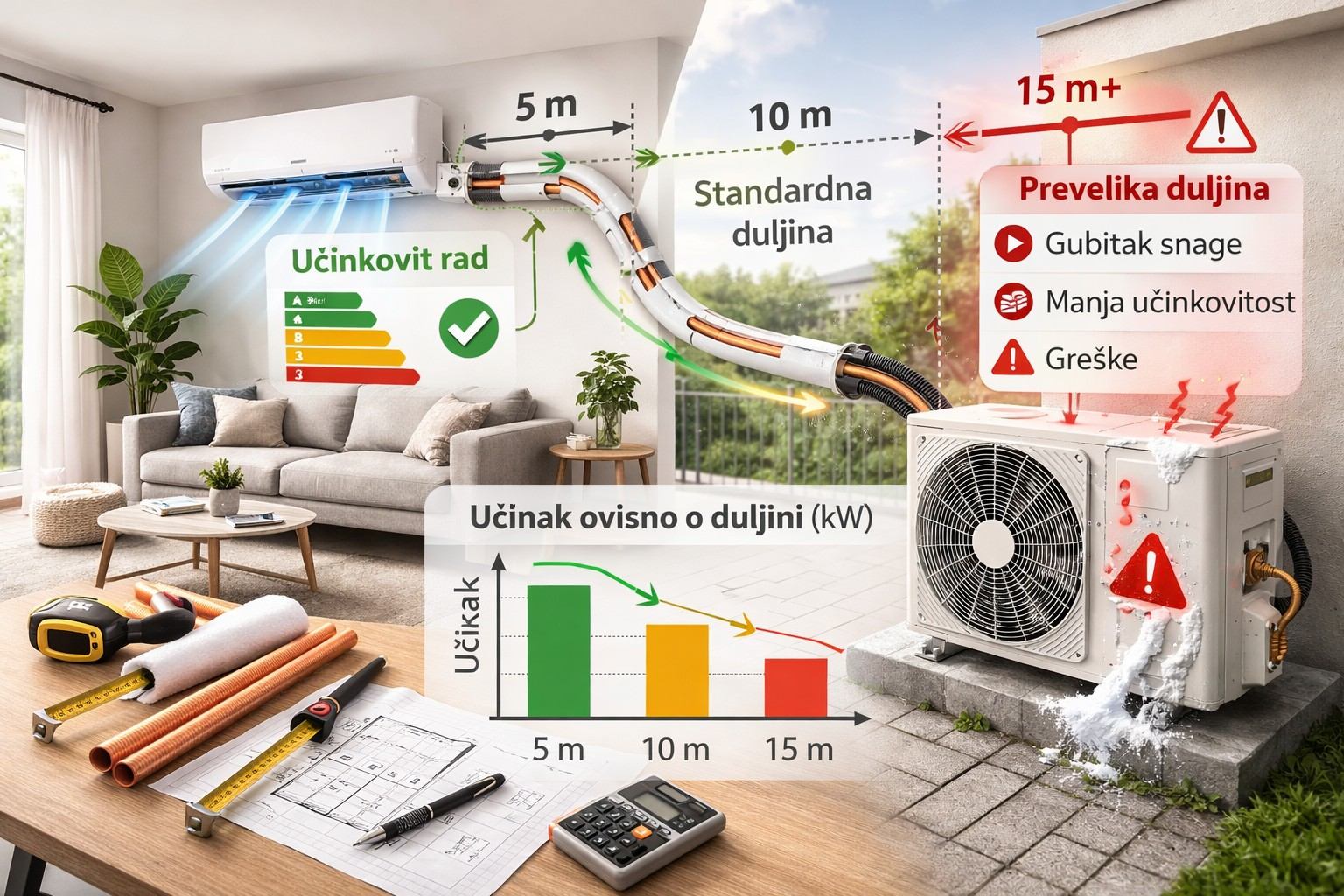 Ako tek birate uređaj, prije ove teme korisno je pogledati master vodič Sve o klima uređajima, pregledati klime po snazi, klime po kvadraturi i isprobati kalkulator klima uređaja. Ovaj članak ne ponavlja opći vodič za odabir klime, nego odgovara na jedno usko i vrlo praktično pitanje: koliko sama duljina trase utječe na stvarni rad sustava.