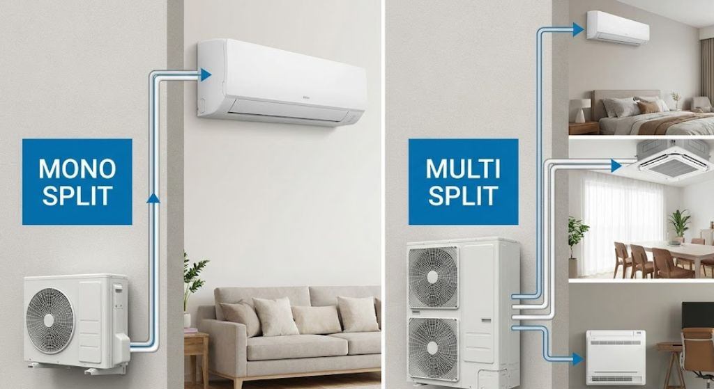 | Karakteristika | Mono / single split | Multi split |