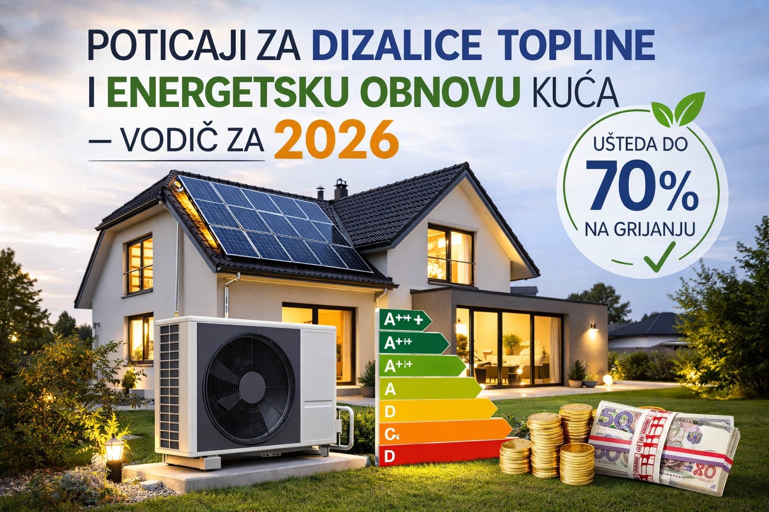 | Kuća se cjelovito obnavlja | Dizalica topline + ovojnica + po potrebi solar | Najveći potencijal ukupne uštede |